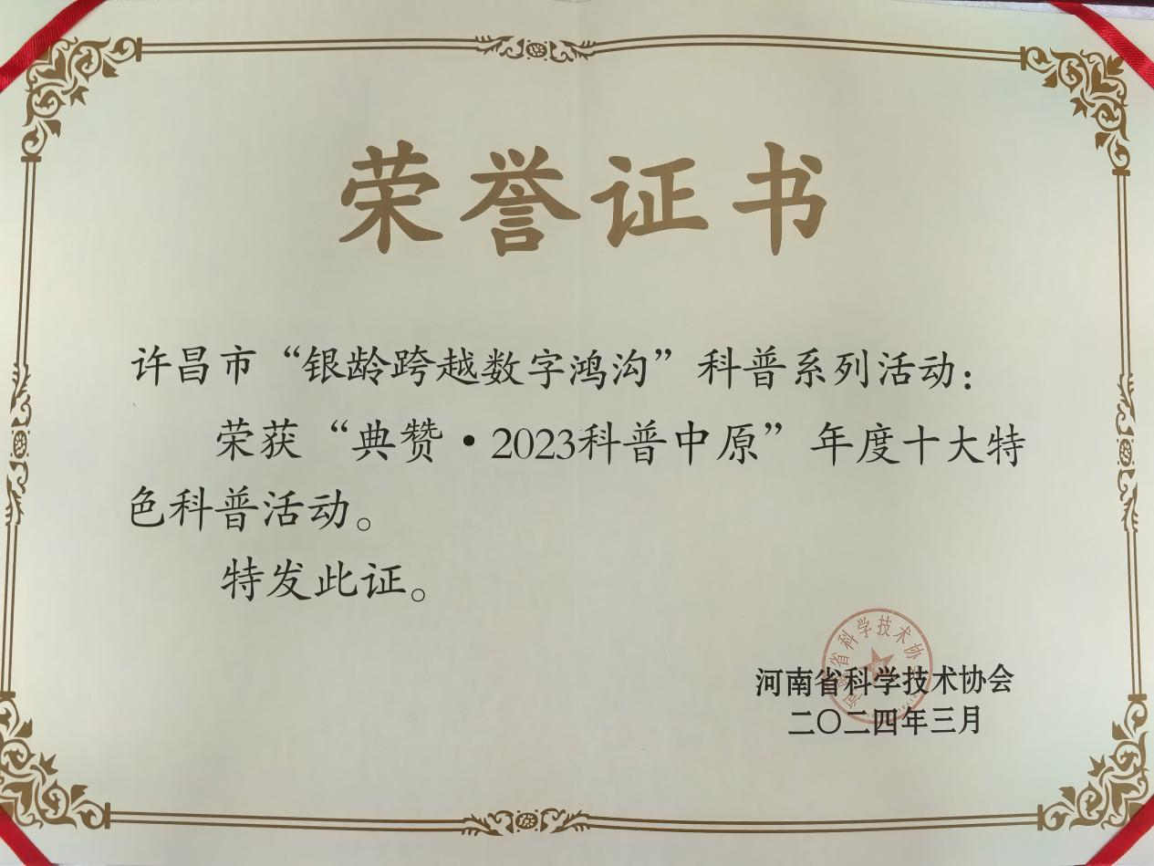 年度十大特色科普活动证书A7G许昌市科学技术协会