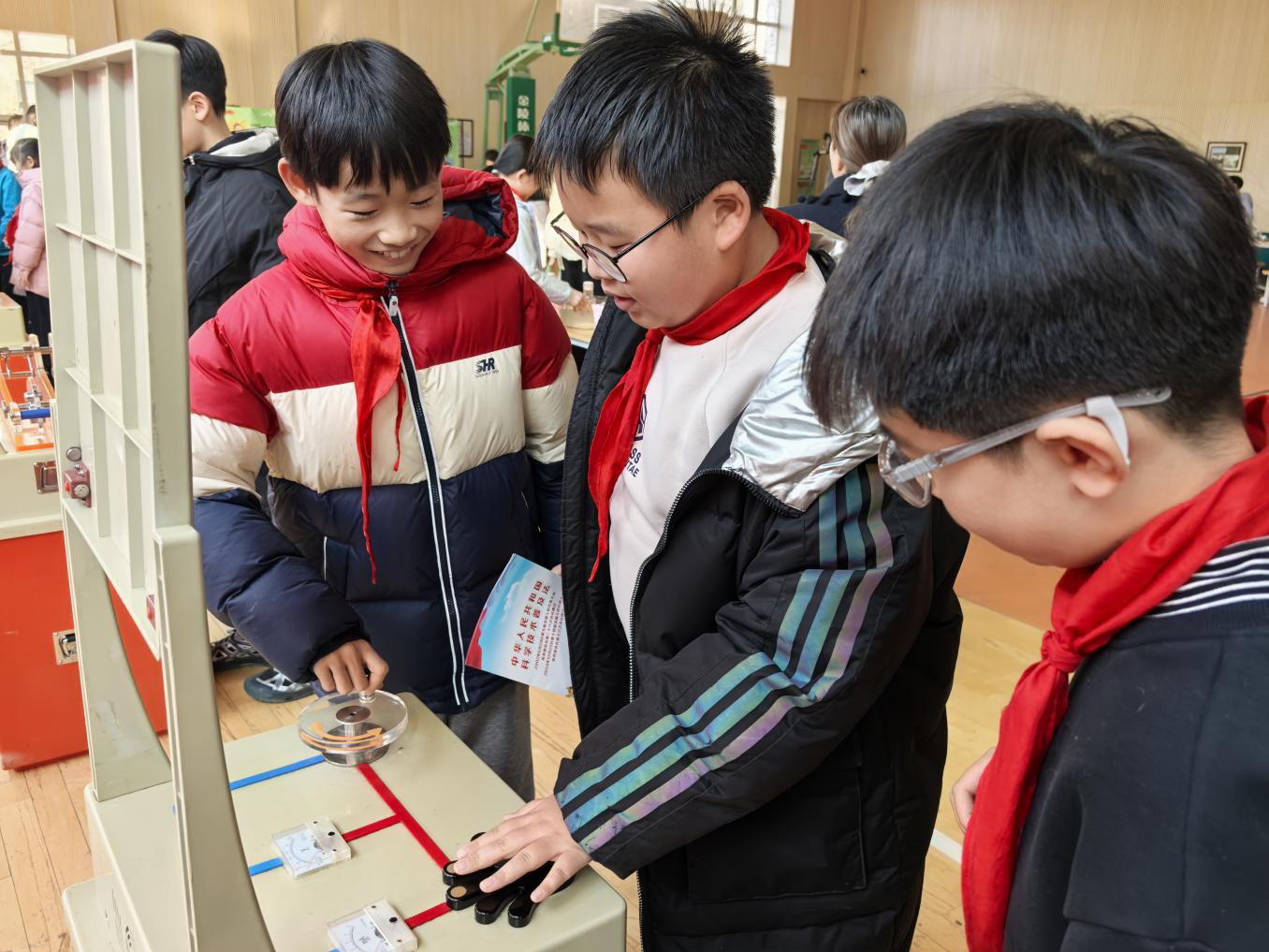 活动现场,科普大篷车带来的互动展品涵盖力学、光学、电学、声学等多个领域,吸引同学们纷纷驻足。“温柔的电击”“看谁跑得快”“小球运动”等趣味展品前,大家有序排队、动手尝试,或专注探索科学原理,或热烈讨论实验现象,在“玩中学、学中悟”的过程中,将抽象知识转化为直观体验,一张张脸上写满了好奇与兴奋。科普志愿者耐心讲解、引导思考,帮助同学们在互动中启迪思维,感受探索的乐趣。