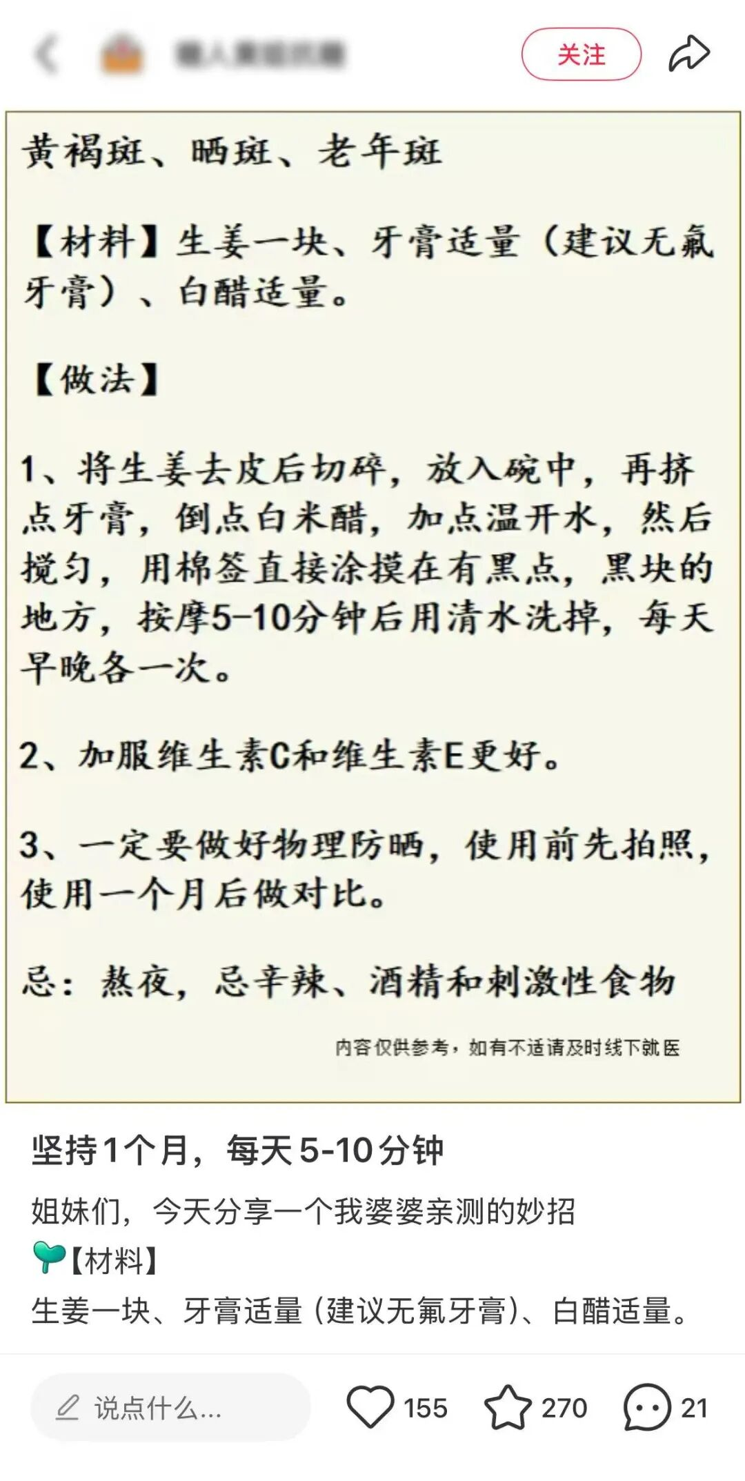 网上有人分享祛老年斑的“秘方”,“去皮生姜+牙膏+白米醋混在一起,涂抹在脸上有斑的地方,过一段时间老年斑就可以祛除。”